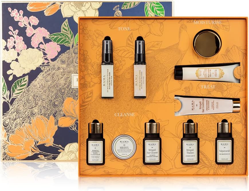 This gift box contains hair and skincare products beginning with Rosewater which tones the face, is a natural astringent and tightens the pores. The face cleanser cleans the skin leaving it soft and supple. Infused with rose and jasmine essential oils that hydrates the skin. The Mridul soap is a combination of herbs, cereals and pulses that cleanse and exfoliate the face. The Eladi face cream contains Costus and Cardamom which moisturizes and hydrates the skin. Bringadi oil to reduce hair fall, Liquorice to reduce scalp infections. Indigo to reduce premature grey. There is also a hair cleanser made from precious Ayurvedic herbs to increase hair volume. And many more other products in this set!!